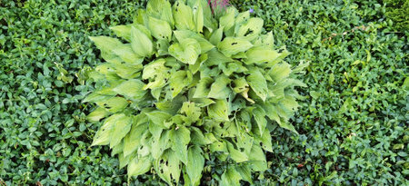 Hosta plant bush in a background texture full of succulent green color. Casting shadow under itself.
