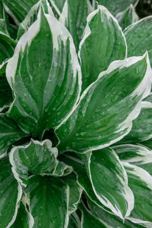 Green leaves with rain drops texture background. Natural background and wallpaper. Leaves of hosta (funkia) with wavy white patterns