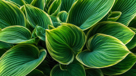 Vibrant garden scene showing intricately veined green hosta leaves highlighted by gentle yellow margins, forming a striking natural mosaic.