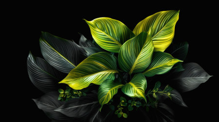 Tropical leaf forest glow in the dark background with copy space. High contrast concept.