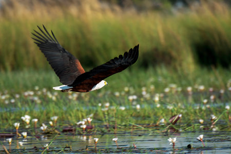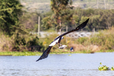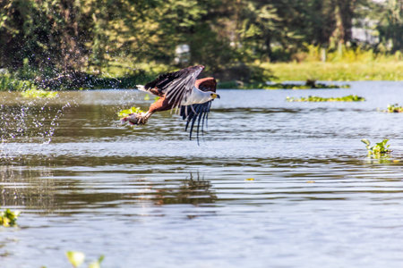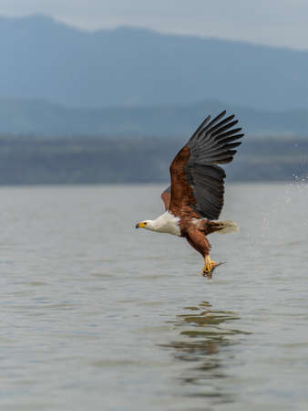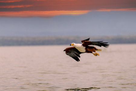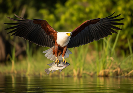 Majestic african fish eagle in flight over water capturing prey
