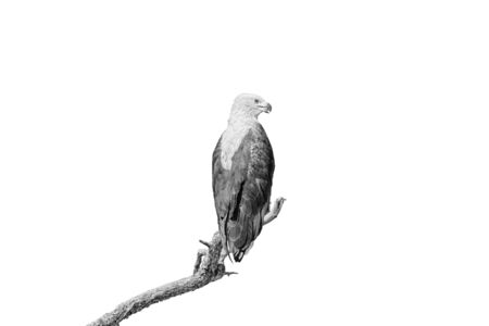 An african fish eagle, Haliaeetus vocifer, on a dead tree branch, isolated on white