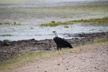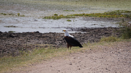 African Fish Eagle, Haliaeetus vocifer, single bird on ground, Tanzania