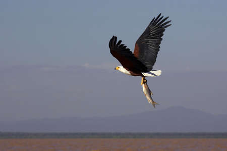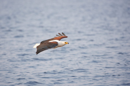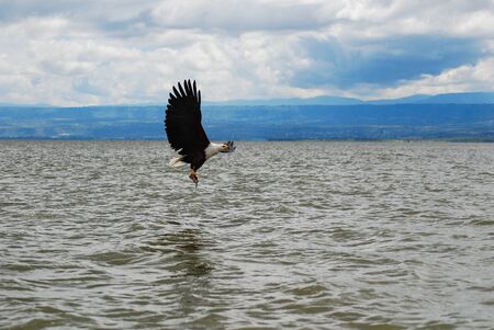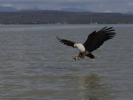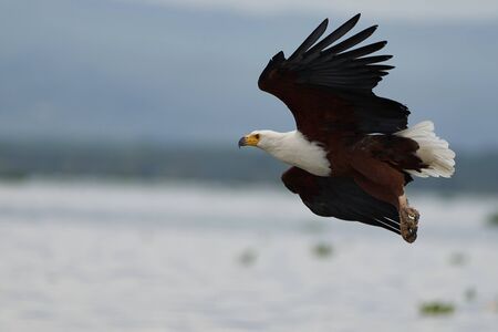 African Fish Eagle (Haliaeetus vocifer) hunting for fish on Naivasha lake, Kenya