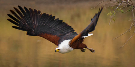 African fish eagle glides carrying nesting material
