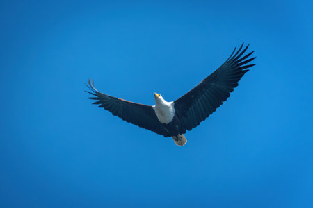 African fish eagle gliding through blue sky