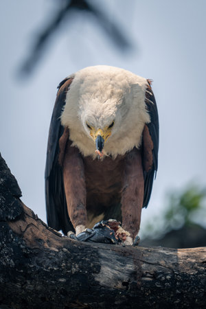African fish eagle bends to eat fish