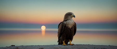 A beautiful confident eagle sits on the background of the sky and the sea at sunset or dawn. Copy space for advertising text