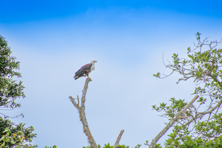 An African fish eagle looking for prey from the top of a tree in the Queen Elizabeth National Park, Uganda