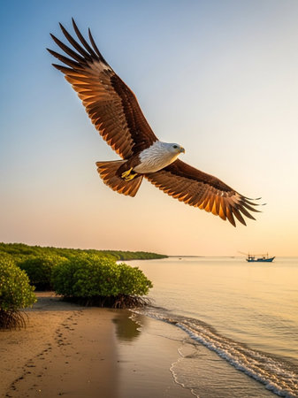 Sea Eagle flying over the mangrove forest at sunrise.