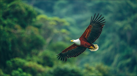 An eagle with brown and white plumage is captured mid-flight against a blurred green forest. The image exhibits natural daylight creating highlights and shadows. The composition suggests freedom. The visual may be suitable for editorial content or commercial projects focused on nature.