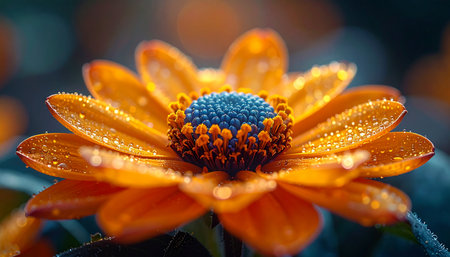 A stunning macro photograph capturing the intricate details of a vibrant orange flower after a gentle rain. Tiny dewdrops cling to the delicate petals, highlighting its fresh beauty against a soft, blurred background. The contrasting deep blue center draws the eye, creating a captivating and serene natural abstract.