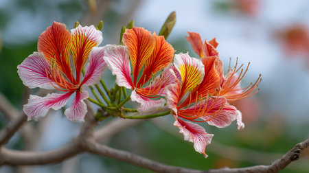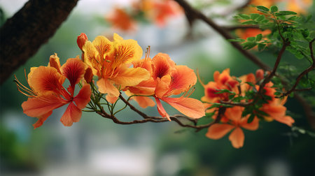 Beautiful flamboyant flowers in vivid orange and yellow hues blooming outdoors