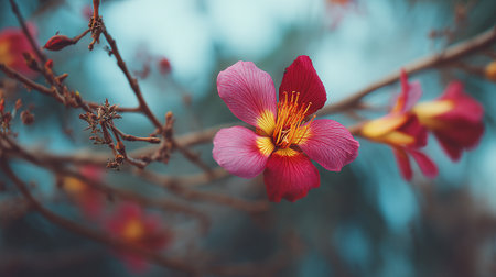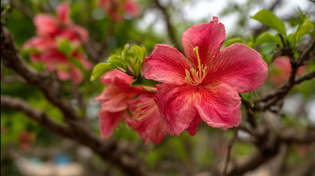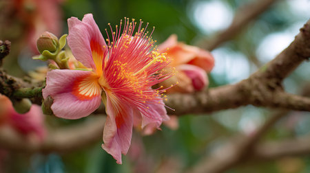 Stunning Pink and Orange Flower Bloom with Yellow Stamens on Branch
