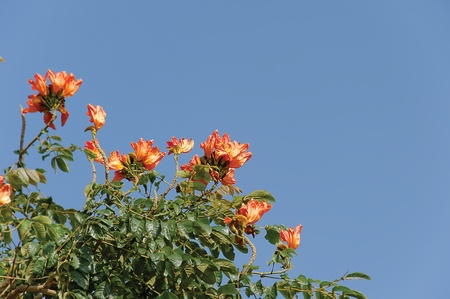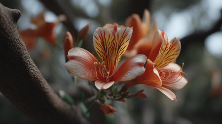 Close-up of Exotic Orange Flowers with Branch and Buds in Natural Setting