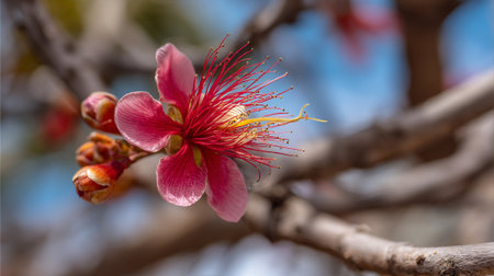Reddish-Pink Flower Blossoming in Early Spring on a Slender Branch