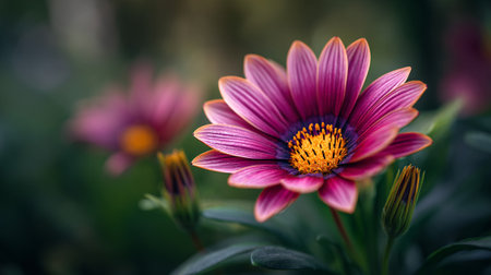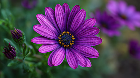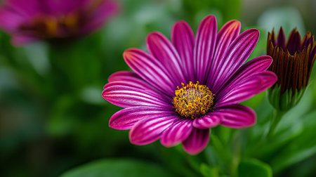 Striking Purple Daisy with Bud on Greenery Background in Natural Light
