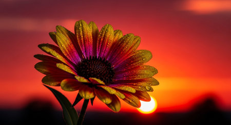 Beautiful gerbera flower with water drops on sunset sky background