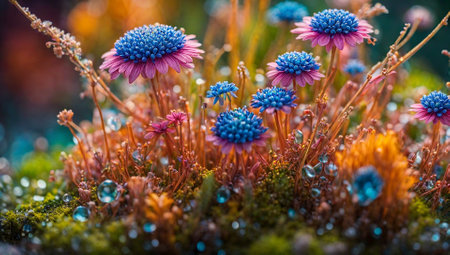 Close up of pink and blue flowers in the moss with dew drops