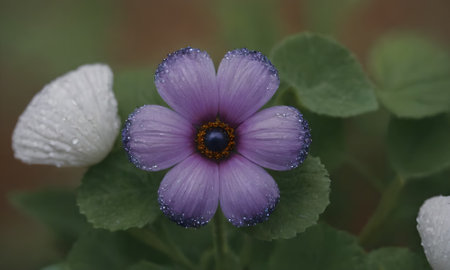 Purple flower with drops of water on petals and green leaves