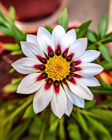 Close-up of a vibrant gazania flower with creamy white and deep red petals.