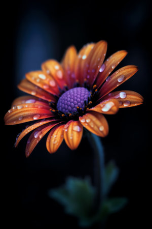 A flower with dew drops on its petals against a dark background, with the droplets reflecting light and adding a sense of depth and richness to the image.