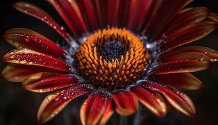Close up of red gerbera daisy flower with water drops