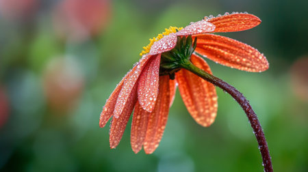 An artistic composition of a single flower stem with dew-covered petals against a blurred background, capturing the freshness of nature and the beauty of early mornings.