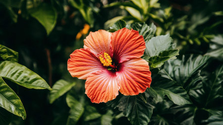 A stunning hibiscus flower in shades of red and orange stands out against a backdrop of lush green leaves, showcasing natural beauty and vibrancy.