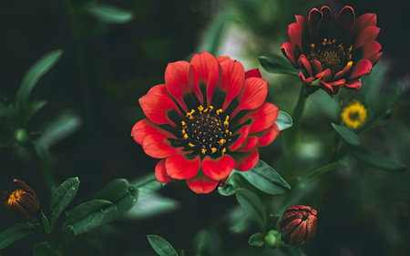 colorful flower on dark tropical foliage nature background