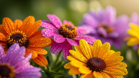 Close up of colorful daisy flowers with water drops on petals