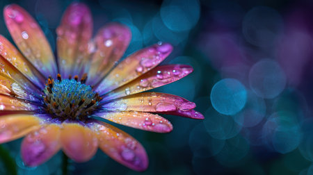 Vibrant macro photograph of a colorful daisy adorned with water droplets. The blurred circular bokeh and glowing light reflections create a cinematic and radiant atmosphere.