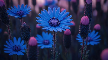 Colorful blue blossoms stand tall, surrounded by lush greenery as daylight fades.