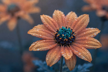 Close-up of an orange daisy with a brown center against a muted teal background