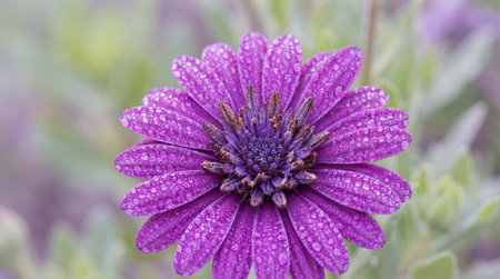 Vibrant purple daisy covered in morning dew drops with soft green foliage and gentle pastel background bokeh.