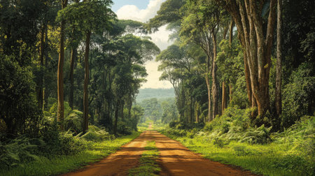 AI Generated. Winding Dirt Road Through Lush Green Jungle Surrounded by Tropical Foliage with Copy Space for Text