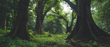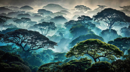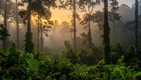Serene foggy jungle landscape featuring dense ancient trees and lush greenery under soft golden morning light in a tropical environment