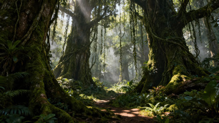 Monumental, centuries-old jungle giants with thick, textured moss and hanging lianas creating a shadowy, humid environment where shafts of golden light cut through the morning haze.