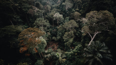 Dark moody aerial view of dense forest canopy showing varied foliage and textures