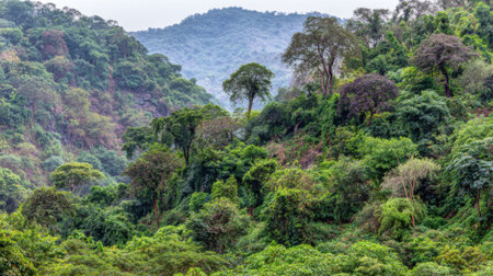 A scenic view of a dense jungle canopy with diverse trees and lush foliage covering a mountain slope under an overcast sky, showcasing a vibrant ecosystem.