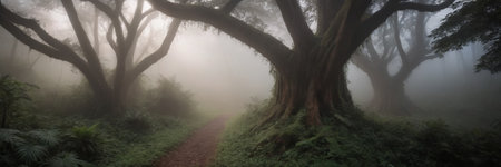 Tall trees tower in a dense forest, surrounded by a mystical mist. The early morning light filters through the foliage, creating a tranquil and enchanting environment.