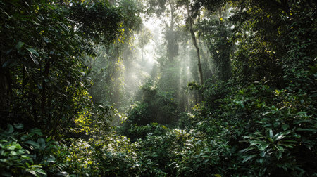 Bright rays of sunlight pierce through the lush greenery of a rainforest, illuminating the misty air and revealing diverse plant life in the serene morning atmosphere.