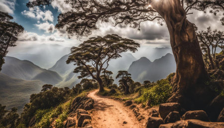 An AI generated illustration of a scenic hiking trail leading up a towering mountain, flanked by lush evergreen trees