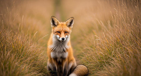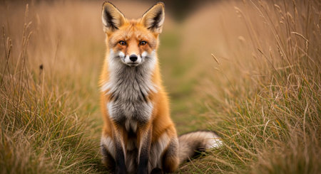 Red fox (Vulpes vulpes) sitting in grass at sunset