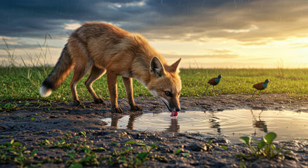 Red fox, Vulpes vulpes, drinking water from a puddle.