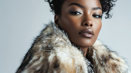 A striking and confident portrait of a woman wearing a luxurious fur coat, exuding elegance and sophistication. Perfect for concepts of beauty, fashion, and empowerment in photography.