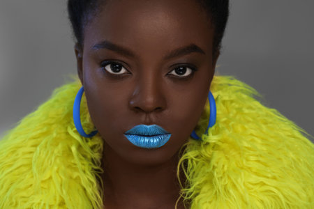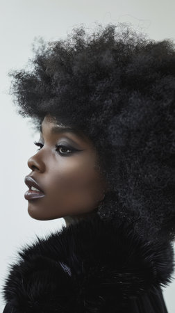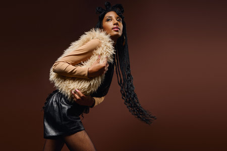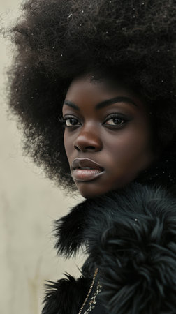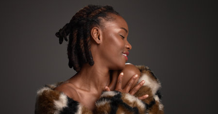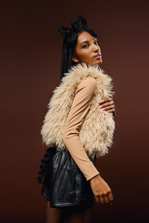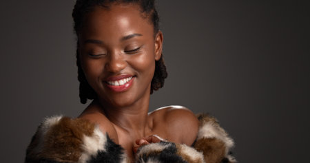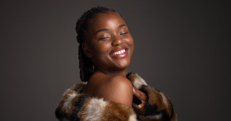 Fashionable plus size African woman with beautiful make-up wearing fluffy coat and smiling