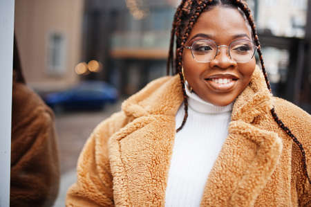 Glamorous african american woman in warm fur coat, eyeglasses pose at street.