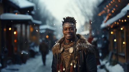 African american man in traditional clothing and headdress on a snowy winter street