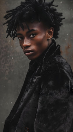 A powerful portrait of a young African American man with short, curly dreadlocks and dark skin He wears an oversized dark coat, standing tall and defiant against a gray wall Subtle snowflakes fall
